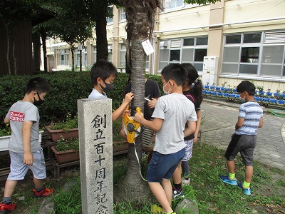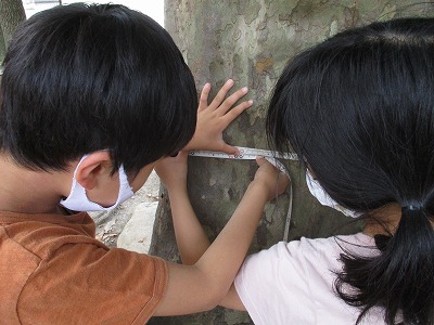 しかし,曲がっているものを測るときや長い長さを測るときなどは,まきじゃくを使います。教室で使い方を学習したあと,外に出て木の幹を測りました。目もりをどこに合わせてよむのか,友だちと協力して練習しました。