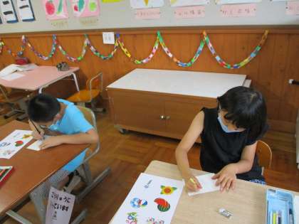 今日ははがきに水彩色鉛筆を使って絵を描きました。スイカやひまわりなどの夏らしい絵を描き,最後に上から水を含んだ筆でなぞってにじませました。
