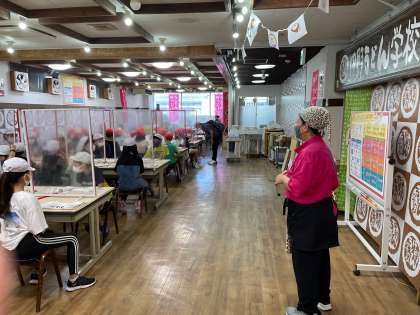 体重を乗せ,力を込めて,生地を伸ばしていきます。