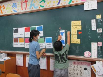 外国語活動の時間に色について学習しています。今日は色々な色のシャツとパンツの中から自分が着たい色の服を選んでコーディネートしました。