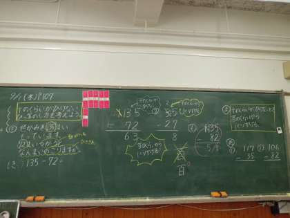 黒板に筆算をかきながら,計算の仕方を説明する子どもが増えてきました。友だちの説明を聞いて「そういうことか!」と呟く子どももいて,友だち同士で学び合う姿が見られるようになり,嬉しく思います。