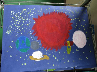 お話を聞いて,想像を膨らませながら描いている絵が完成に近づきつつあります。