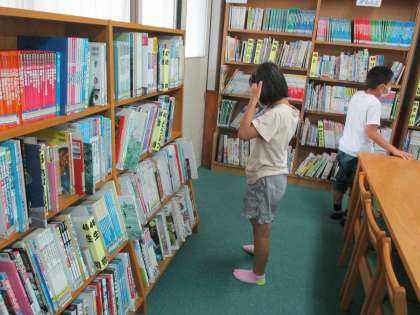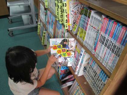 総合的な学習の時間に,身の回りの仕事について考える学習をしています。今日は学校の図書館に行って仕事に関する本を探ました。