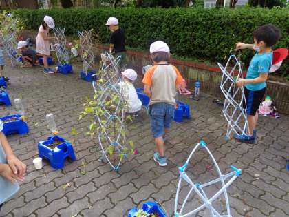 元気に育ったあさがおはつるが支柱にからまっていて外すのも一苦労です。