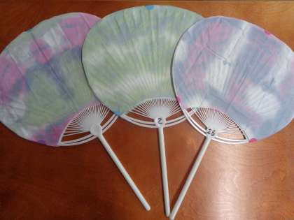 あさがおの花の色で染めた和紙を使って,うちわを作りました。