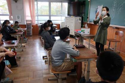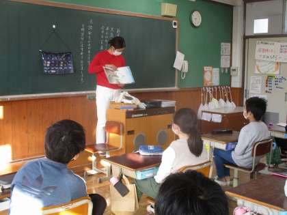 1組では後藤先生が「よんひゃくまんさいのびわこさん」を,2組では岩本先生が「The Giving Tree」という本を読んでくださりました。それぞれの先生が今教えている教科に関係する本で,子どもたちは楽しそうに聞いていました。