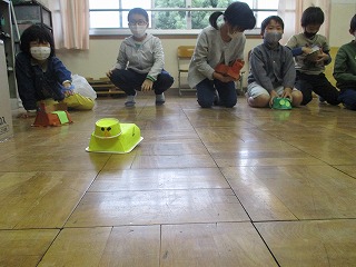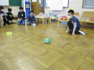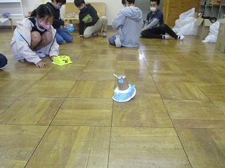 広さのある総合ルームで試してみました。同じ仕組みなのですが,ゴムのつけ方で微妙に動き方が違います。