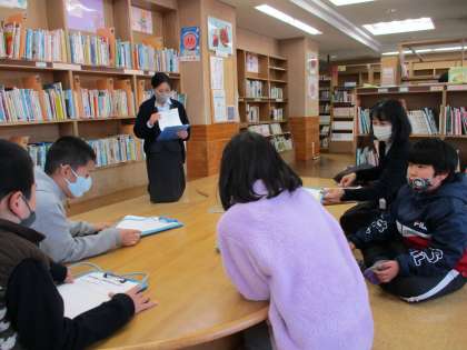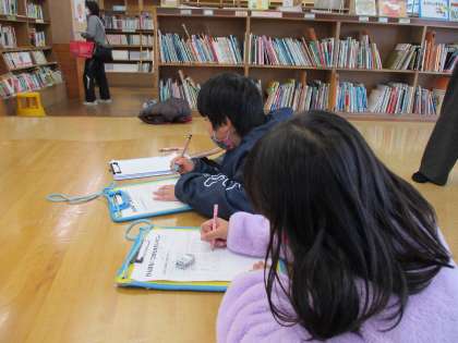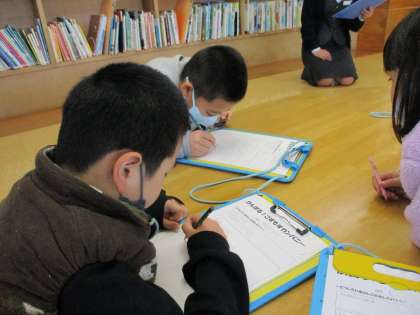 インタビューの後は図書館の絵本を読みました。学校図書館にはない本もたくさんあり,興味をもって読むことができました。