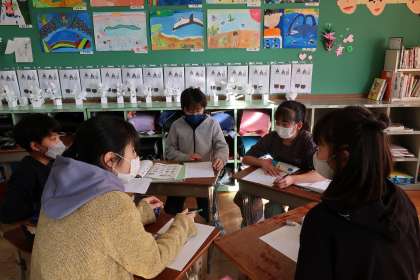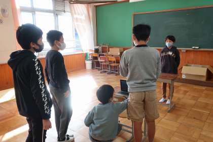 それぞれ班に分かれて,自分たちの思い出を思い出しながらどのような表現を使うか話合い,練習しています。今まで学習した表現を使いながら,楽しそうに練習していました。