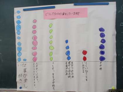 仕事に関するインタビューやアンケートの結果をグラフにまとめました。グラフを見ると,仕事は違っても「仕事が好きだから」や「人の役に立ちたいから」など,同じような理由で働いている人が多いことに気付くことができました。また,自分たちも仕事をしてみたいという意見が子どもたちから出てきました。