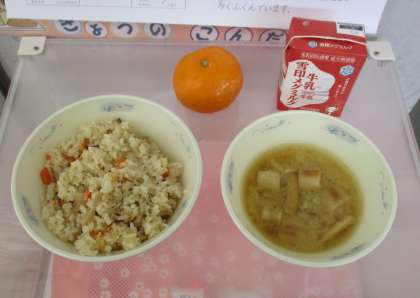 今日の給食は,台風や大雨などの災害が起きたときのために学校で保管していた食材を使って作りました。「炊きこみ五目ごはん」には,水でもどして使う「アルファ(α)化米」,「みそ汁」には,乾燥キャベツや乾燥ごぼう,麩を使用しており,どれも乾燥した状態で長期保存ができる食材です。