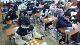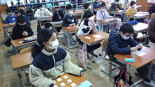 学習の最後には,カードを使って,ビンゴゲームをしました。キーン先生が言う英語のカードを裏返していきます。子どもたちは,耳で聞いて手を動かして,楽しく単語を習得しようとしていました。