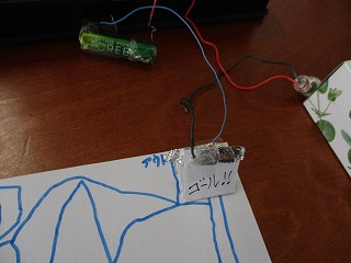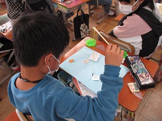 磁石で動く迷路を作り,最後にゴールすると豆電球に明かりがつく仕組みを作った子や,引き付けられる磁石の働きを利用して魚釣りを作った子,片手でスイッチの切り換えができる懐中電灯を作った子,音のふしぎの学習をいかしてでんでん太鼓を作った子など,様々でした。どの子も,もっと作りたい!と楽しんで活動していました。