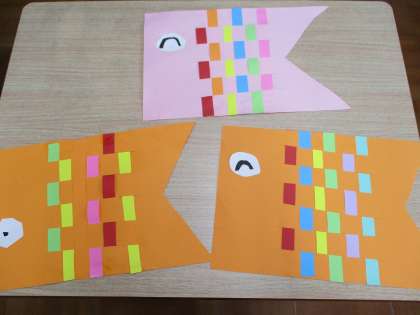 図工の時間に鯉のぼりの飾りを作りました。色画用紙に短冊を交互に編み込んでいき,鱗の模様にしました。