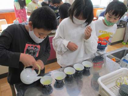 説明をよく聞き,班の友だちと協力して行うことができました。残念ながら入れたお茶を飲むことはできませんでしたが,おいしいお茶の香りを楽しむことができました。