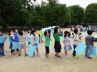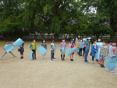 青のカードを手に持ち,空へ向けます。「まだかなー」「もう撮れたかなー」などの声が聞こえました。