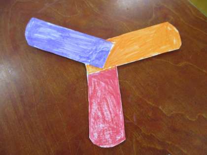 ものづくりクラブでブーメランを作りました。3枚の厚紙を重ねてホチキスでとめ,角を丸く切って好きな模様を描きました。