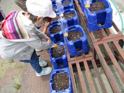 生活科であさがおを育てています。毎朝きちんと水やりをしている姿が素敵です。新しい芽がでていたり,大きくなっていたりとたくさんの発見を毎日伝えてくれています。