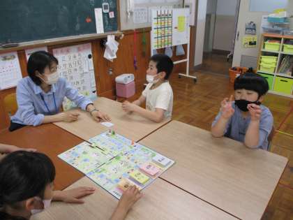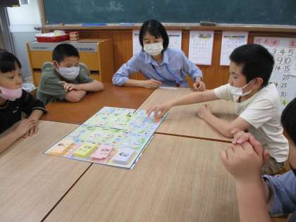 道徳の時間に「なかよしチャレンジ」という学習をしています。すごろくをしながら,とまったマスのカードに書かれた内容を見て「こんなときどうするか?」をみんなで考えました。