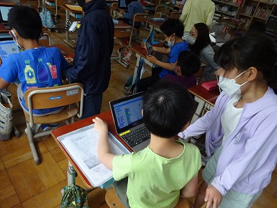 また,スクラッチに挑戦する子もいます。友だち同士,作ったものを見せ合ったり,教えあったりしています。