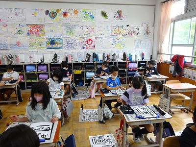 その後,色々な線を書きました。直線,ぐるぐる,ギザギザ…,全て文字の中の一部になります。力の入れ具合によって線の太さが変わることも意識できたようでした。