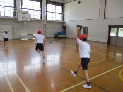体育の時間に長縄とまねっこあそびをしました。長縄はタイミングよく縄を通り抜けたり跳んだりできました。みんなのチームワークが光っていました。