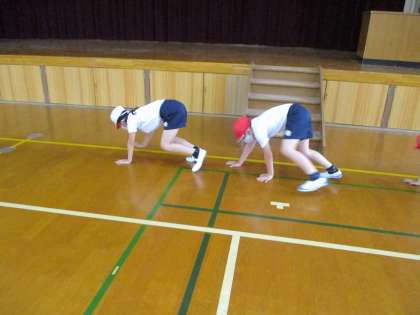 まねっこあそびでは先頭の人の動きを真似てスキップしたりカニや馬になりきったりしました。みんなで色々な動きを考えることができました。