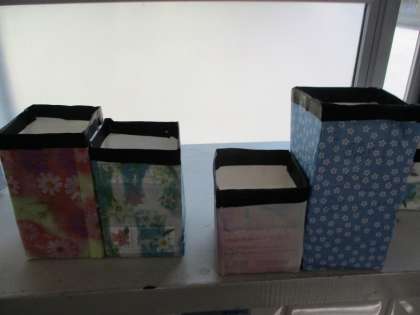 先日作っていたペン立ての続きを作りました。今日は好きな折り紙を牛乳パックに貼った後,黒色の折り紙をふちに貼り,最後にボンドで2つの牛乳パックを引っ付けました。