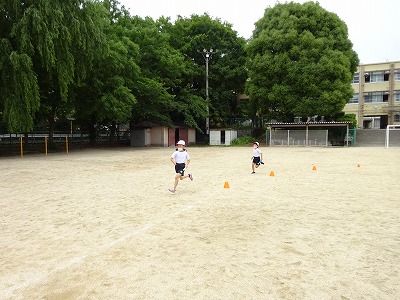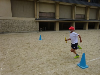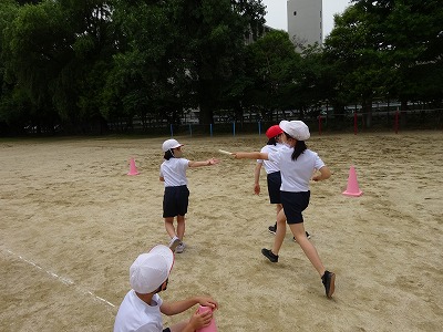 運動場でリレーの学習をしました。バトンパスの工夫によって、素早くパスすることができます。「はい」と声をかけるグループが増えてきました。