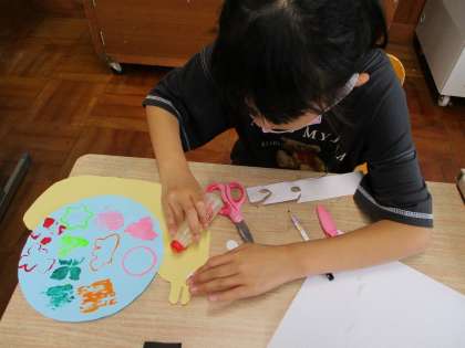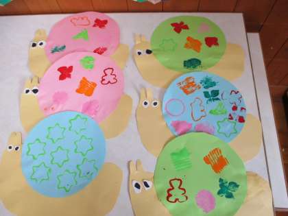 図画工作科の時間にカタツムリの飾りを作っています。今日はカタツムリの体の形に画用紙を切り,先日スタンピングした甲羅の形の画用紙と貼り合わせました。あとは目を付けたら完成です!