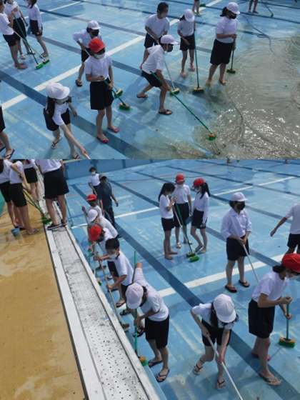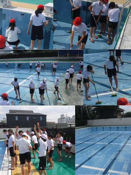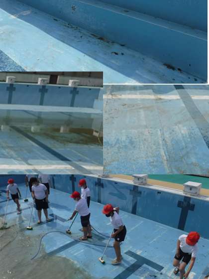 6年生が水泳学習に向けて,プールをきれいにしてくれました。最初はちょっと躊躇する汚れでしたが,手分けして,ごしごし こすってきれいになりました。