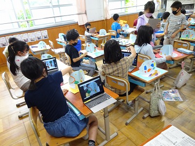 その後,完成した作品を,パソコンで写真や動画に撮りました。「どの角度から撮ろうかなぁ」「回しながら撮ろうかなぁ」などと,撮り方にもこだわっていました。