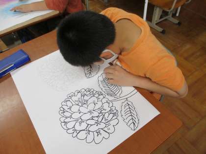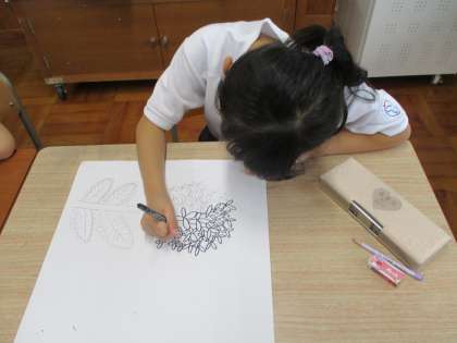 図画工作科の時間にあじさいの絵を描いています。花瓶のあじさいをよく観察し,花びらを一枚一枚描いていきました。