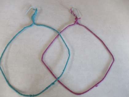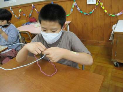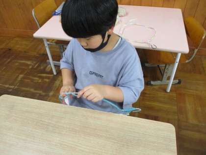 生活単元の時間にシャボン玉を飛ばす道具を作っています。今日は大きなシャボン玉を作るためにハンガーに毛糸を巻き付けていきました。隙間のないように毛糸を巻き付けるのは難しかったですが,がんばりました。