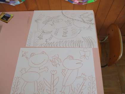 かえるが飛び跳ねたり踊ったりしているところを表現するために手足の動きに注目しながら描きました。次は絵の具で彩色していきます。