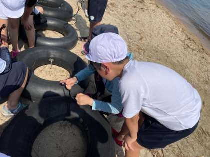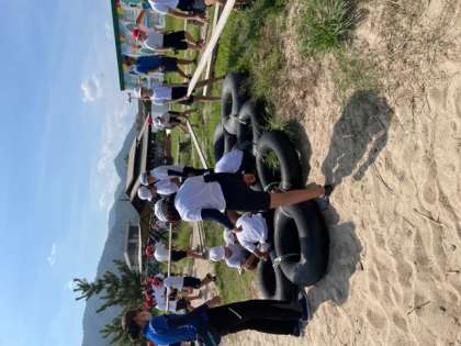 みんなで協力していかだを作っています。しっかりと結んで離れないように。