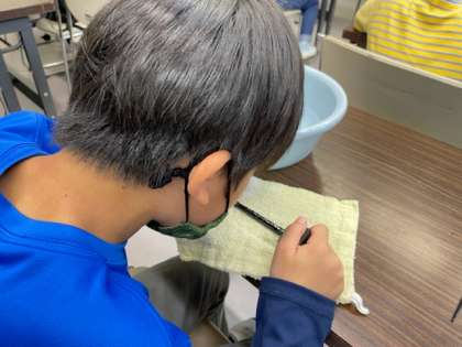 若狭塗り箸づくりの活動をしました。漆の中に隠れている貝殻をヤスリで削り出していきます。なかなか貝殻が見つからなくて苦戦していました。持って帰ってお母さんにあげようと話している子どももいます。