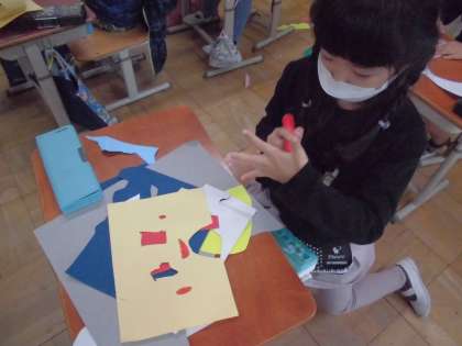 自由に切った色画用紙から,どんな形が想像できるかな?と,それぞれの感性を十分に発揮して形を考えていきました。