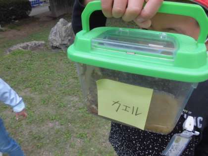 生活科の学習では,校内で見つけたバッタやカエル,ダンゴムシを各教室で飼っています。