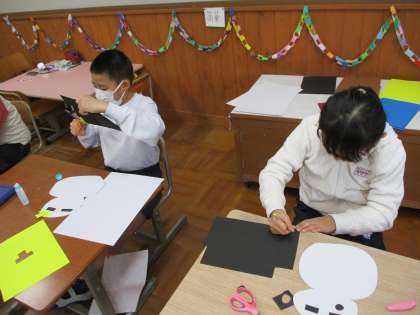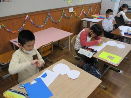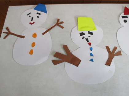 図画工作科の時間に雪だるまの飾りを作りました。まず雪だるまの形に画用紙を切って、そこに帽子や目や鼻や口を付けていきました。目や鼻や口の形は自分の好きな形にしました。そしてボタンや手を付けたら出来上がりです。