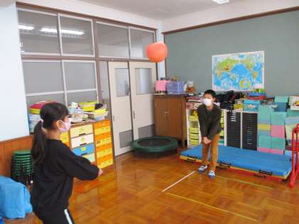 休み時間にソフトバレーボールをして遊んでいます。初めはサーブが高く上がらず、相手までボールが届きませんでした。練習するうちにだんだんと上手になり、ラリーが続くようになりました。今日は5回も続きました。メキメキ上達しています。