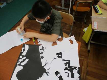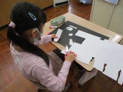 図工で「はさみのアート」をしました。画用紙を好きな形に切って黒い画用紙に貼っていきました。渦巻や星などみんな思い思いの形に切っていきました。