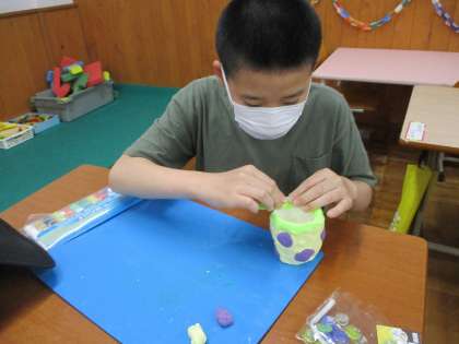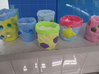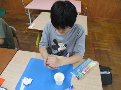 紙コップに粘土をつけてペン立てを作りました。好きな模様を付けたり、おはじきやビー玉を付けたりして自分だけのペン立てが出来上がりました。