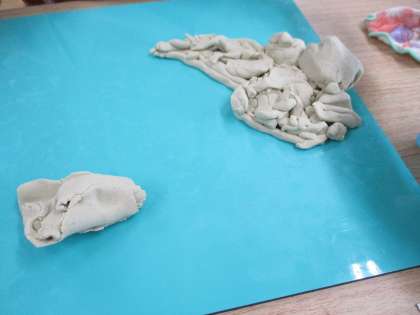 今日は粘土を使って細く伸ばしたりつなげたりしました。その後、パン屋さんになって、粘土で色々なパンを作りました。