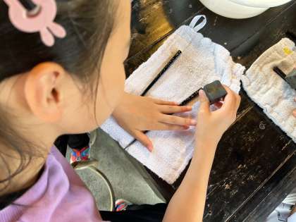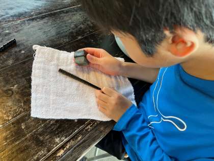 若狭塗り箸を作っています。石のやすりで漆を削り取り、埋め込まれた貝殻を浮き出させます。鮑の貝殻が出てきます。