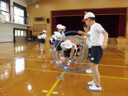 ようぐあそびでは前回よりも,みんなで遊ぶことのできる使い方を考えてくれました。わっかを長く繋げて,くぐってとわいわい楽しんでいました。楽しくて「もう一周したい!」という子も出てきました。
