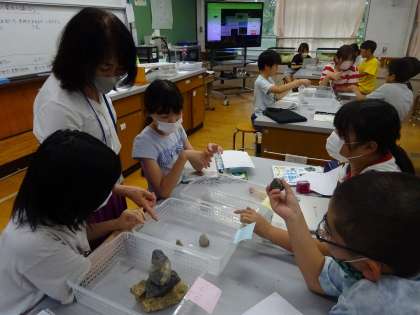 流れる水の働きを知るために、実際に水を流したり、石の様子を観察したりしました。