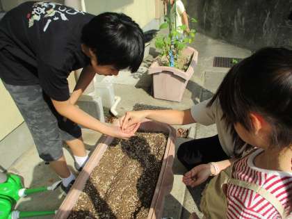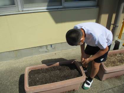 こすもすのプランターに野菜の種を蒔きました。今回はほうれん草とラディッシュの2種類です。1か所に3粒ずつ丁寧に種を蒔きました。芽が出るのが楽しみです。