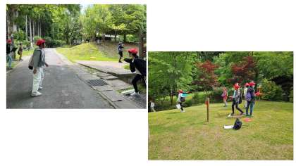 午前の活動です。フライングディスクを使ってのゴルフです。全17ホールあります。どこまで回れるかわかりませんが、よい天気の中、所内での活動を楽しんでいます。