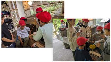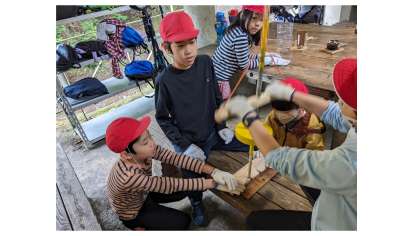 火おこしをするために、グループの協力は欠かせません。道具をみんなで支えて火おこしを頑張っています。どうしたら火が起きるか、話し合いも必要です。